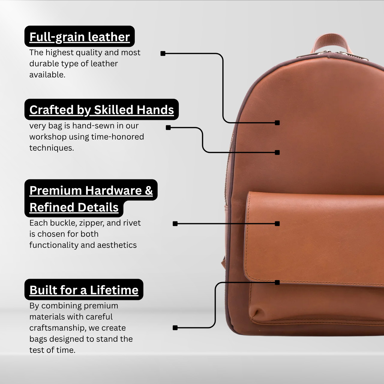 The Phoenix Leather Backpack is our refined take on the classic backpack, blending modern and vintage aesthetics with its two-tone leather and sleek lines. Designed for maximum organization and functionality, it features two main compartments that can easily accommodate a couple of outfits for a getaway or your work essentials and lunch. Experience both style and utility with the Phoenix Carry On Backpack.